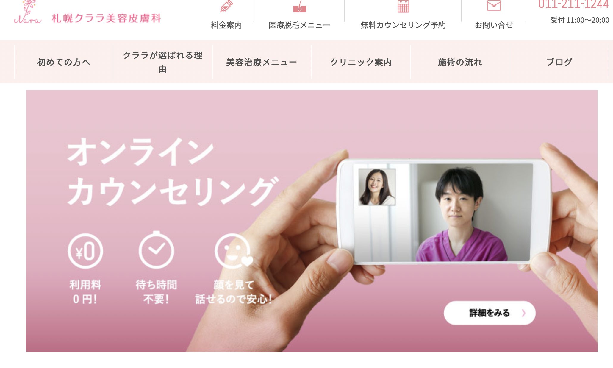 美容クリニックに通院する際に、医師によるきちんとしたカウンセリングやアフターフォローは大切なポイントです。札幌クララ美容皮膚科では、カウンセリングとアフターフォローが無料で受けることができます。そのため、気軽に相談することが可能です。また、オンラインカウンセリングもできます。