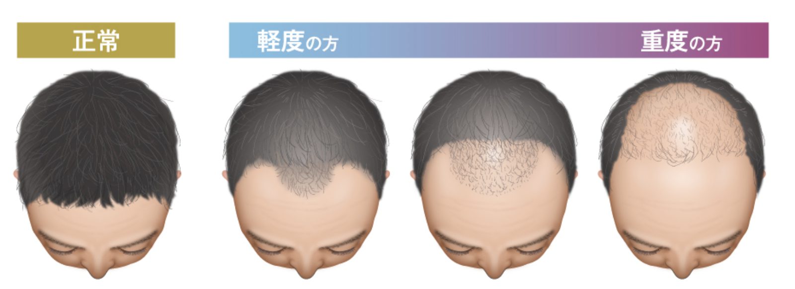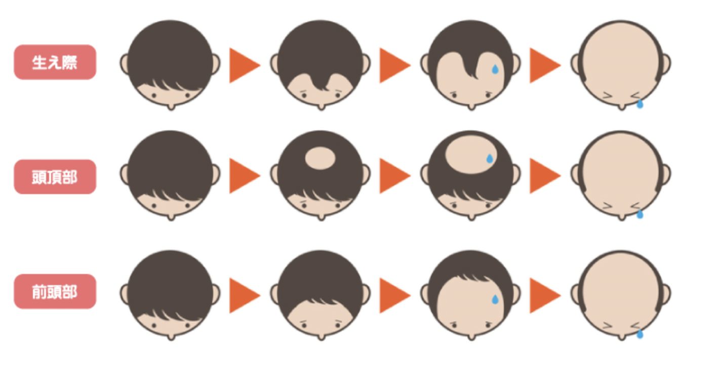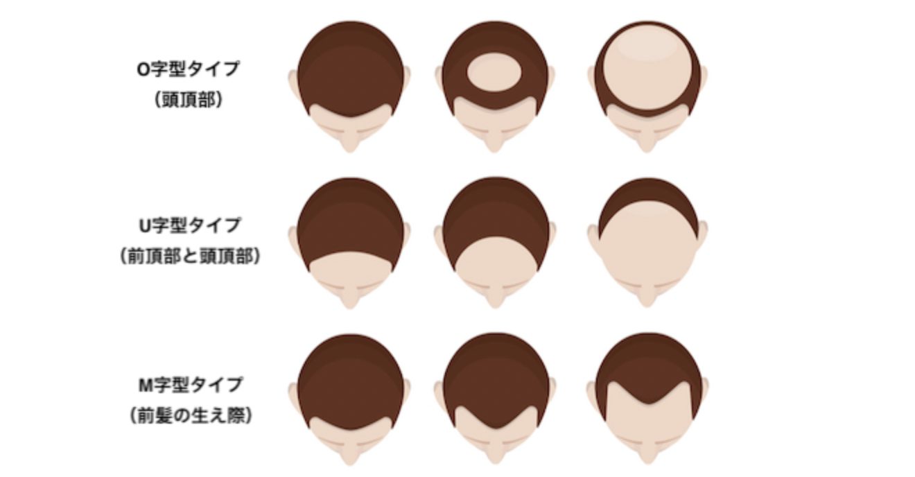 主に成人男性に見られる進行性の脱毛症で、髪が生え際や頭頂部、あるいはその両方から薄くなるのが特徴です。