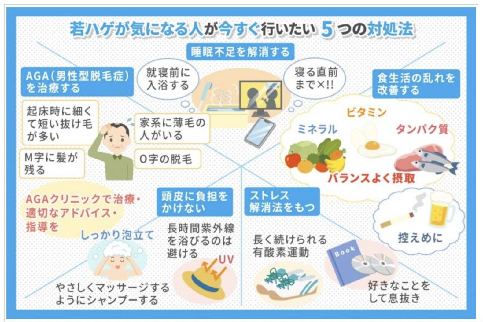 AGAを予防するためには規則正しい生活習慣を送ることが大切で、特に下記の項目は意識するべきポイントです。