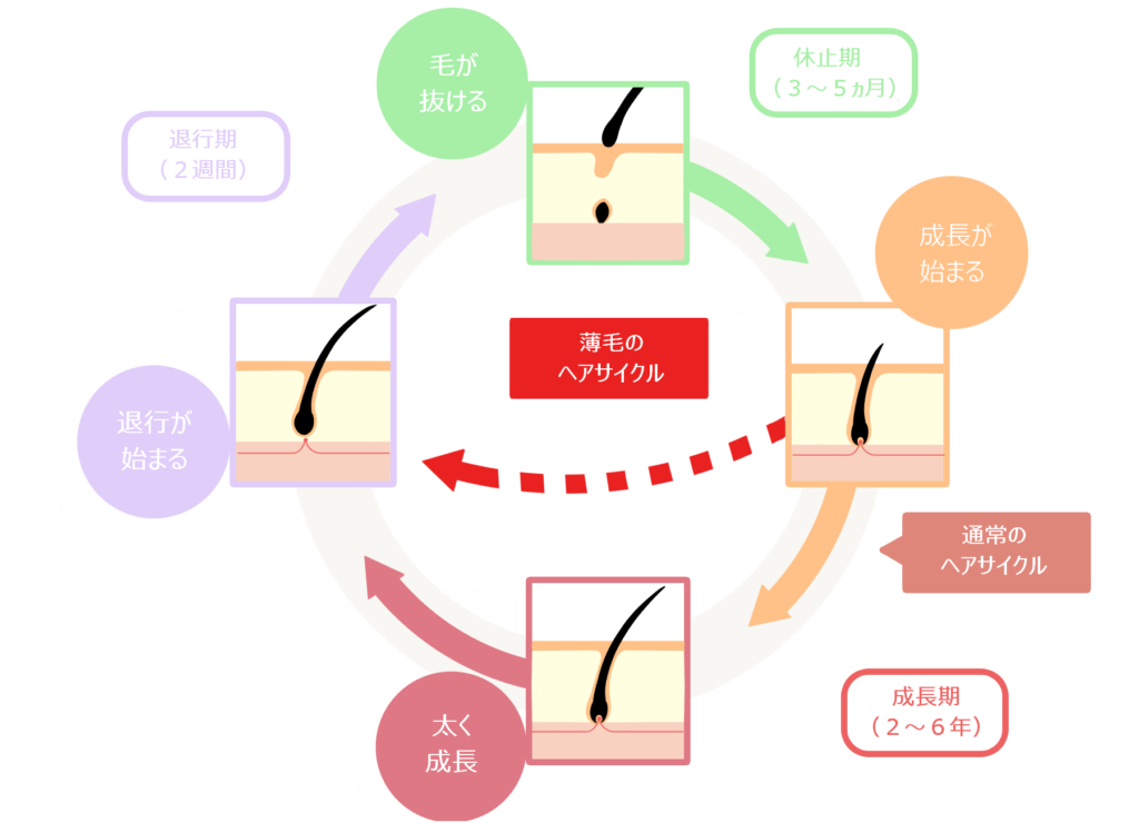 毛周期とは毛が生えるサイクルのことを表しますが、毛周期が乱れることで健康的な髪の毛が生えづらくなり、抜け毛が増える原因になります。毛周期が乱れる原因は遺伝・ストレス・生活習慣の乱れといわれています。