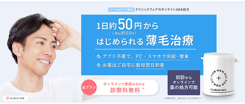 クリニックフォアのAGA治療はオンライン診療にも対応しています。クリニックに直接通院せずに、カウンセリング〜治療薬の配送がオンラインで完結するので、他の人の目が気になって通院するのに抵抗がある人や、忙しくて通院する時間がない人にぴったりです。