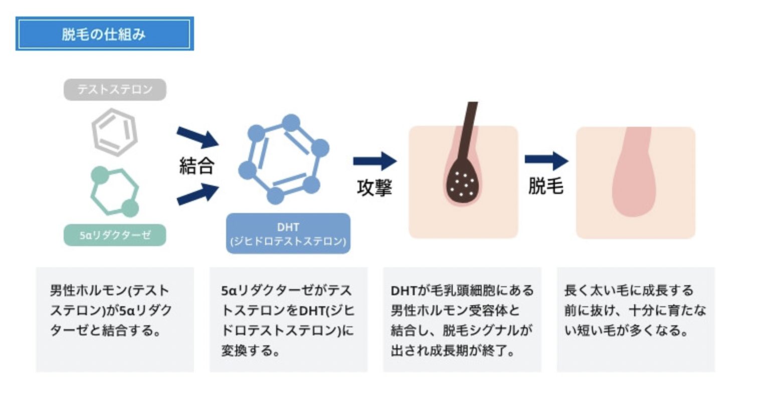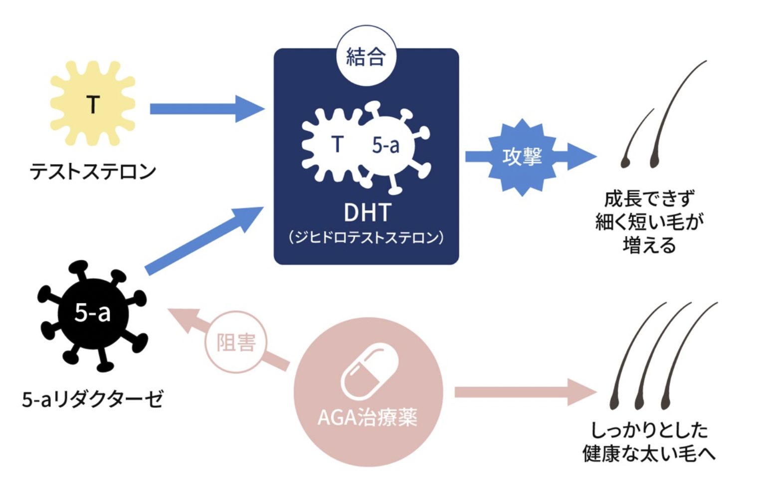AGAは、誰にでもあるテストステロンという男性ホルモンと、5αリダクターゼという酵素の結合をきっかけに発症します。