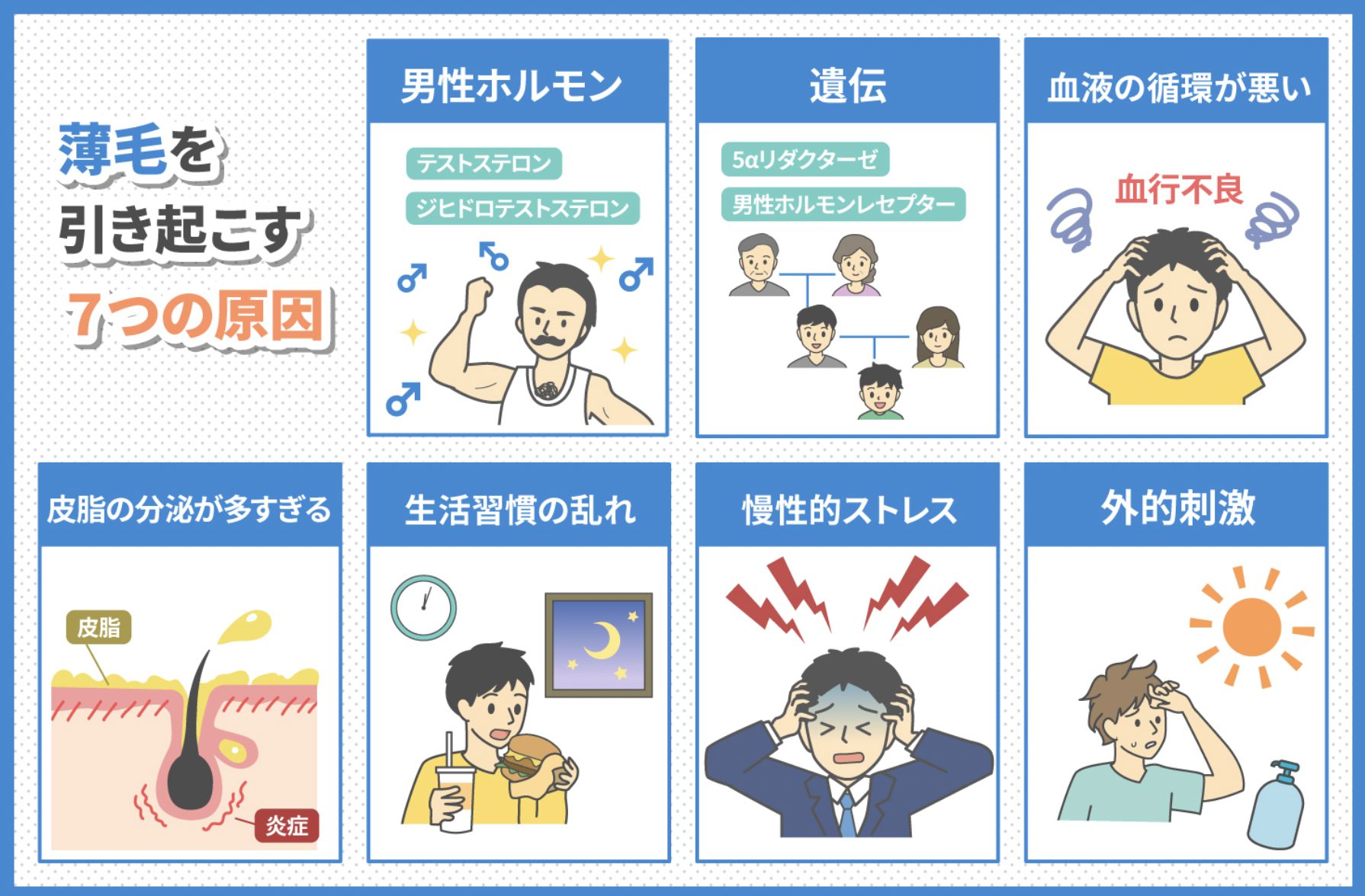 - ジヒドロテストステロンが毛母細胞の活動を低下させ薄毛になります。