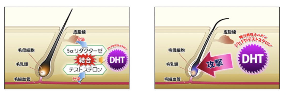 - テストステロン(男性ホルモン)が5αリダクターゼ(酵素)と結合するとジヒドロテストステロンに変化します。